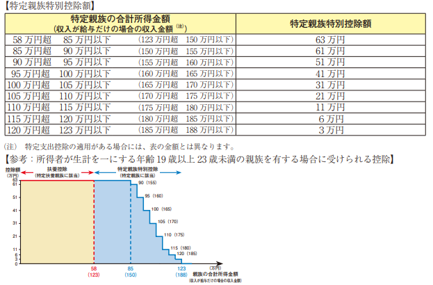 【特定親族とは】所得者と生計を一にする年齢19歳以上23歳未満の親族(配偶者、青色事業専従者として給与の支払を受ける人及び白色事業専従者を除きます。)で合計所得金額が58万円超123万円以下の人をいいます。なお、下記の「参考」のとおり、親族の合計所得金額が58万円以下の場合は、特定親族特別控除の対象とはなりませんが、扶養控除の対象となります。
