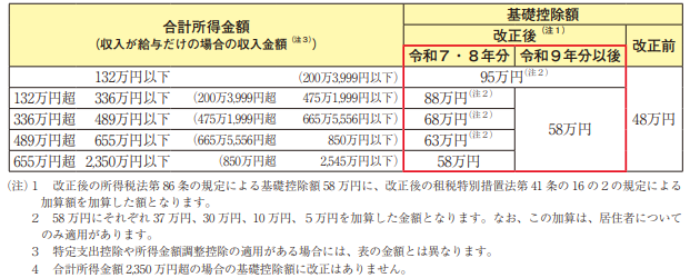 次のとおり、合計所得金額に応じて、基礎控除額が改正されました。