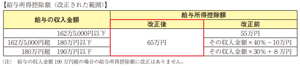 給与所得控除について、55万円の最低保障額が65万円に引き上げられました。
